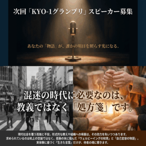 来場者の投票により決定した優勝者は、昨年のKYO-1グランプリ聴講が学院に行くキッカケにもなった杉田明信先生。学院入学前に起こった事柄を「神様からのお試し」と思っていたが、学院で「神様に遊ばせていただく」とは自分の心配や不安を神様に素直にお願いしてさせていただくことだと受けとめ「神様には素直に何事もお願いしてみましょう。そして、神様と一緒に今を楽しみましょう」と力強く締めくくった。